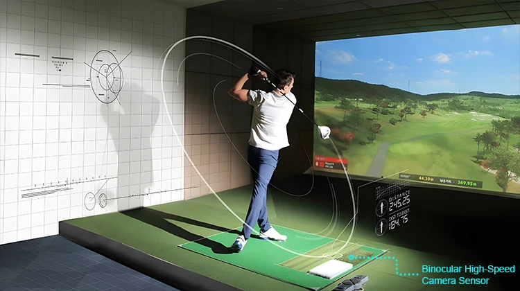 The system projects high-definition golf course visuals. High-speed cameras track the swing and ball path, and the software calculates results in real time, projecting the ball trajectory and score on the screen for an immersive golf experience.