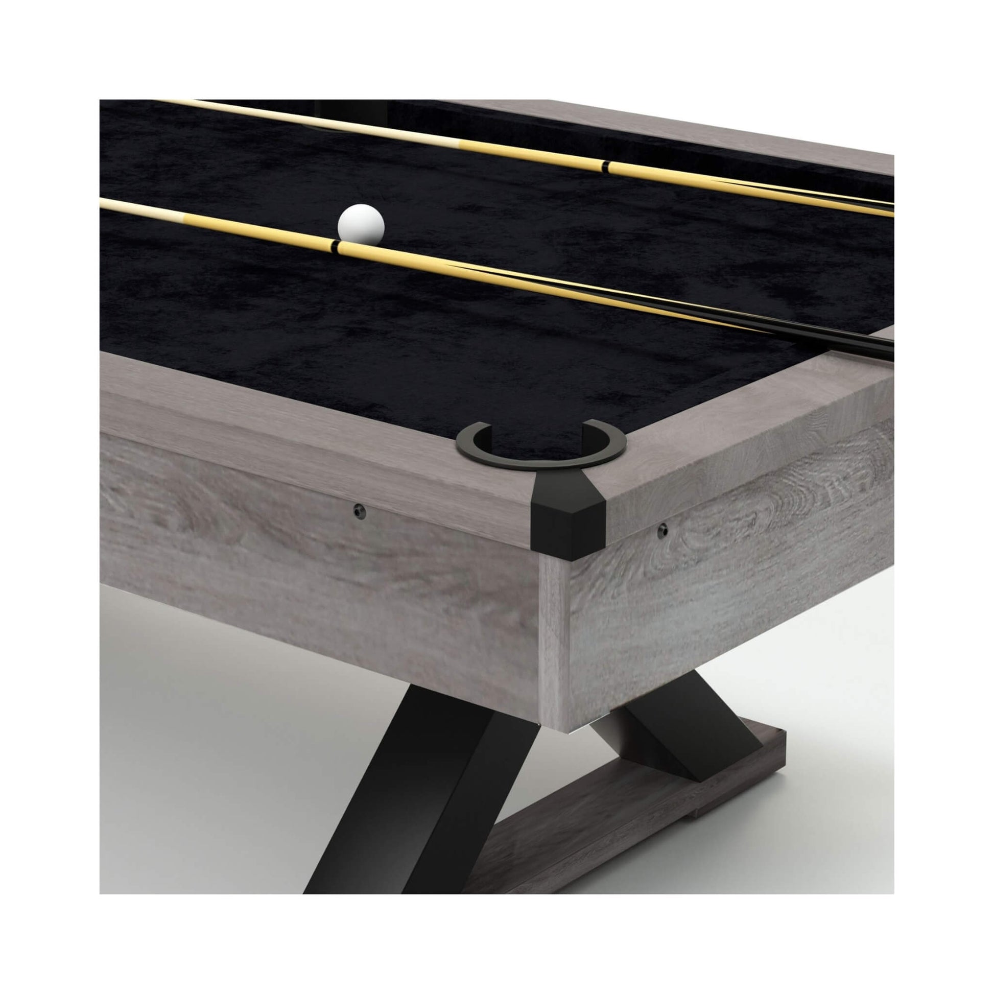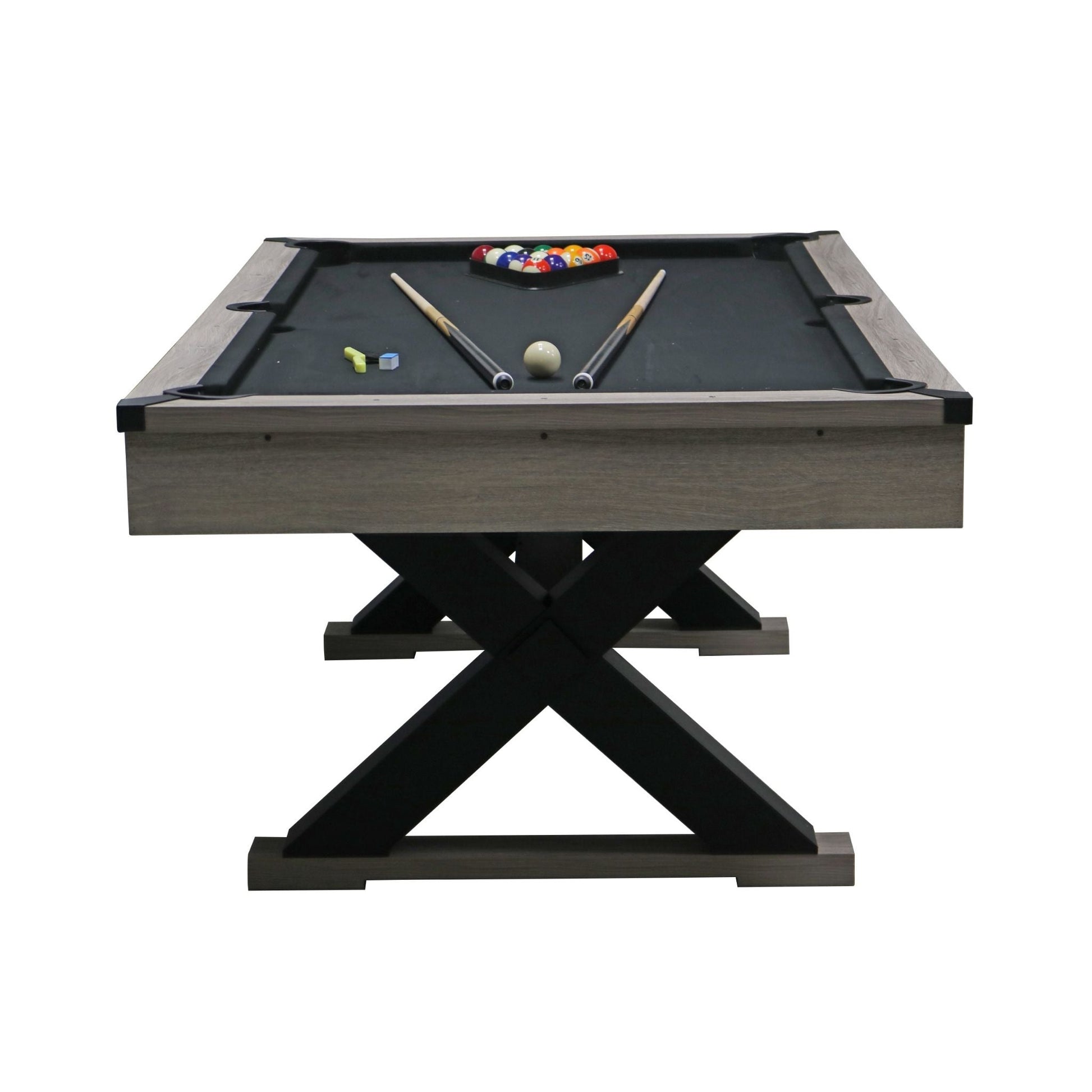 - The pool table features a distinctive and stylish X-shaped leg design, enhanced by a rustic black finish that brings a touch of sophistication while adding an element of fun for all users.
