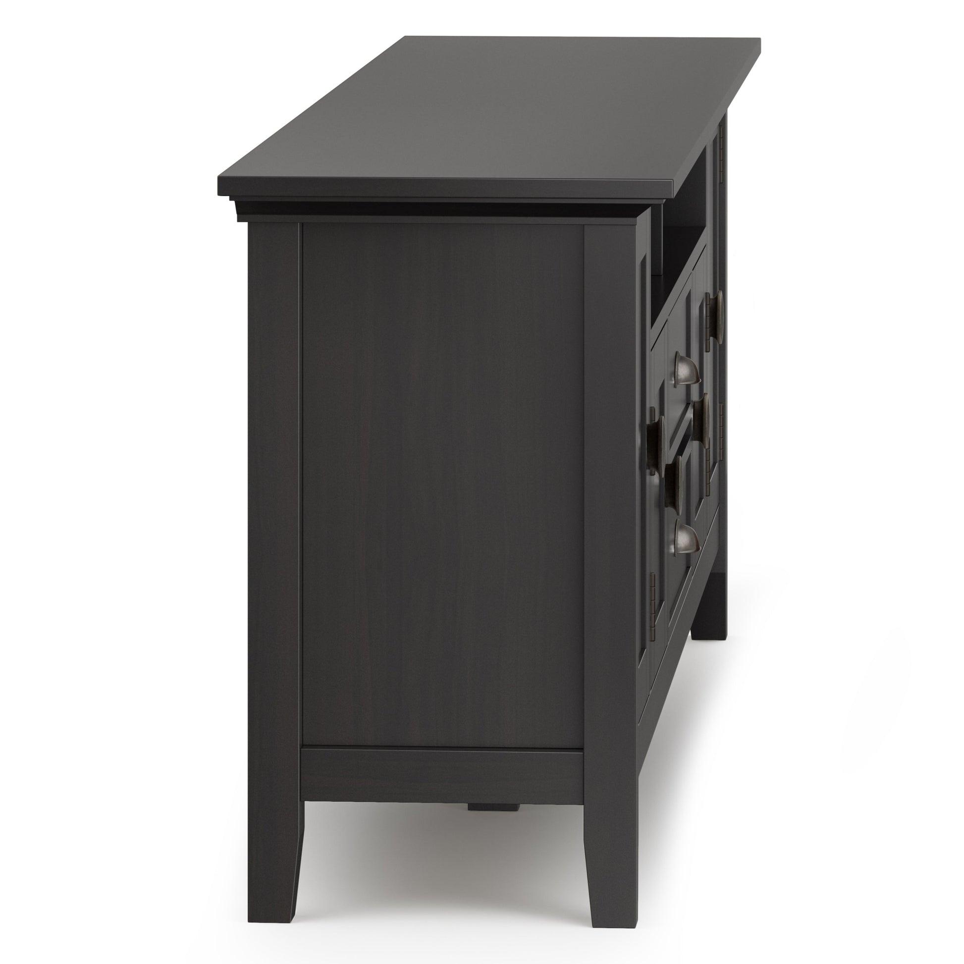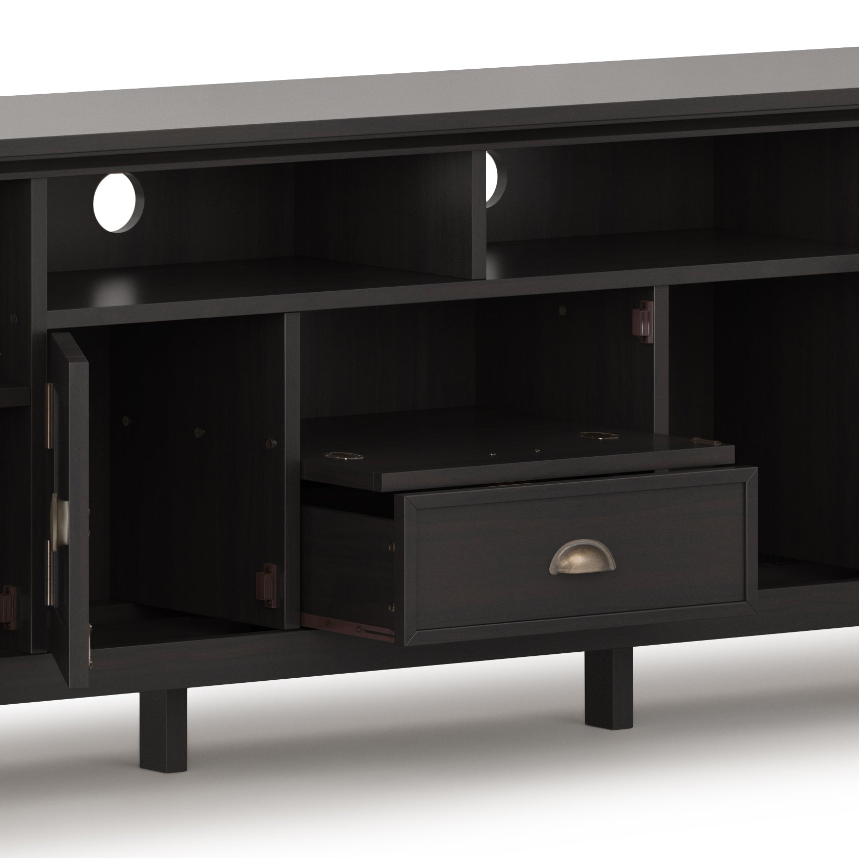 - Features a large centrally located open area with two (2) drawers as well as two (2) framed doors with enclosed spaces; the two l(2) arge side storage cabinets open to one (1) adjustable shelf each.